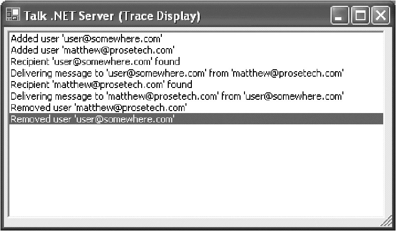 The timer fires and refreshes the list of user names seamlessly every 30 seconds. In a large system, you would lower this value to ease the burden on the coordinator. For a very large system with low user turnover, it might be more efficient to have the server broadcast user-added and user-removed messages. To support this infrastructure, you would add methods such as ITalkClient.NotifyUserAdded() and ITalkClient.NotifyUserRemoved(). Or you might just use a method such as ITalkClient.NotifyListChanged(), which tells the client that it must contact the server at some point to update its information.