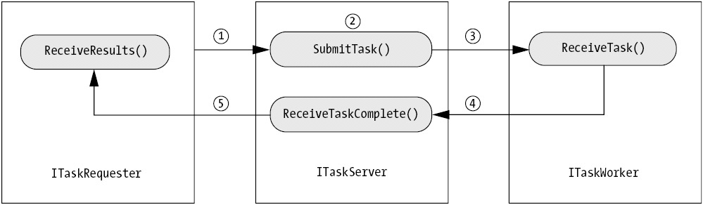 The ITaskServer interface defines methods for registering and unregistering peers, for receiving a task request, and for receiving a task-completed notification. Optionally, you might want to add a method such as ReceiveTaskCancel(), which would allow a worker to signal that it's unable to finish processing the assigned task (possibly because it's shutting down).