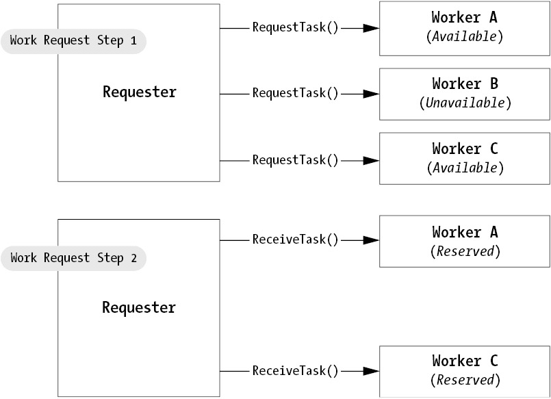 One way to implement this is to reduce the role of the central component, as you'll see in the third part of this book. For example, you could replace the work manager with a basic discovery server. A peer that wants to request a task would then query the server, which could return a list containing a subset of available workers. The peer would then contact these peers to begin a new task. In this scenario, you would need to use a two-stage commit protocol. First, the peer would contact workers and ask if they were available. If the worker is available, it would respond "yes" and make itself unavailable for any other requests for a brief time period while it waits for an assignment from the requester (possibly five minutes). Next, the requester peer would deliver task segments to all the workers it had reserved. (See Figure 6-9.)