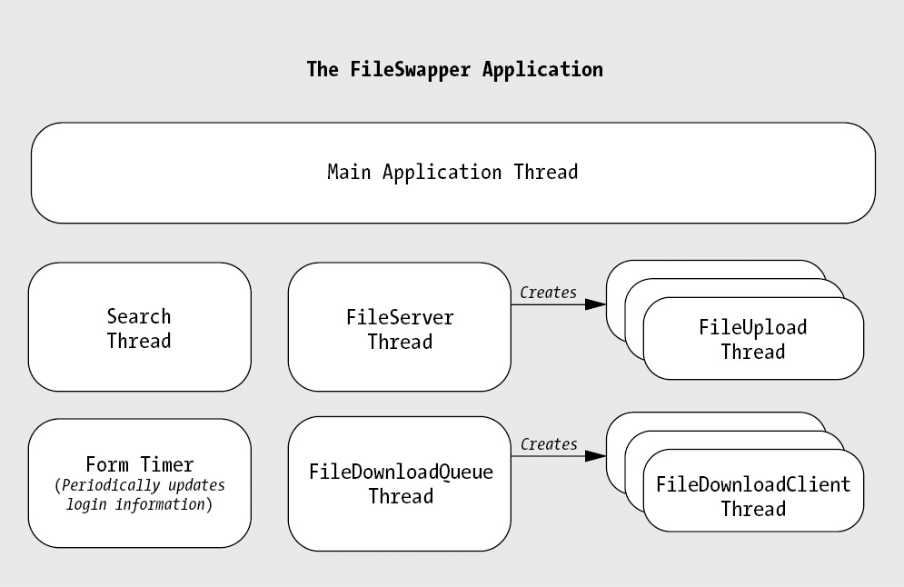 The full FileSwapper application can be downloaded with the code for this chapter. In this chapter, we'll walk through all the threading and networking code, but omit more trivial details such as namespace imports and the automatically generated Windows designer code. We'll begin by examining some of the building blocks such as the classes used to register the peer, to read configuration information, and to process MP3 files. Next, you'll look at the code for searching available peers. Finally, you'll see the multithreaded code for handling simultaneous uploads and downloads over the network.