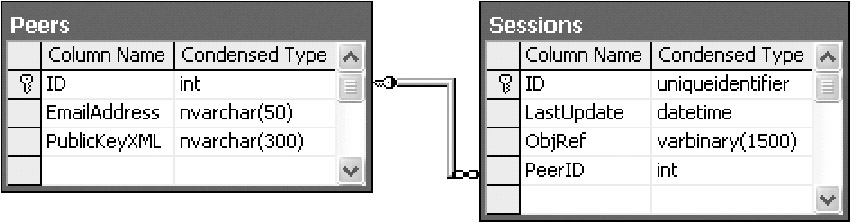 Note that the database table only includes the public key information. This is enough for the server to validate signatures from the user. The server should never be given access to a user's private key, because that information must be carefully protected! The peer will store the full key pair on the local computer. In our example, this information is simply saved to the peer's hard drive, which means that an attacker could impersonate the user if the attacker can steal the key file. Other approaches might be to store this data in the registry, in a secure database, or even in a custom piece of hardware. The latter provides the best security, but it's obviously very unlikely in a peer-to-peer scenario.