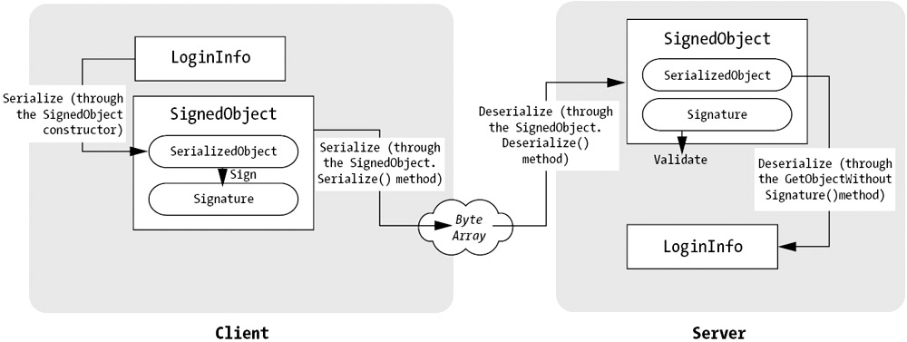 In this example, the dedicated class is called SignedObject. The SignedObject class allows you to attach a digital signature to any .NET object using serialization. Here's how the signing process works: